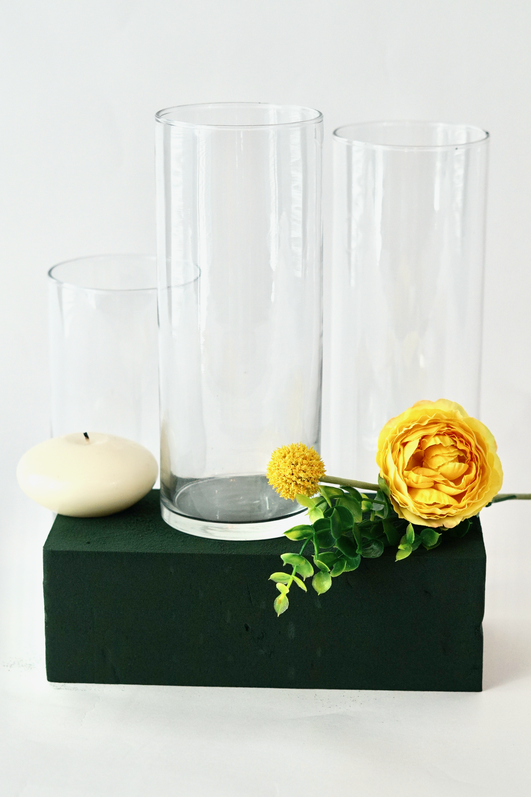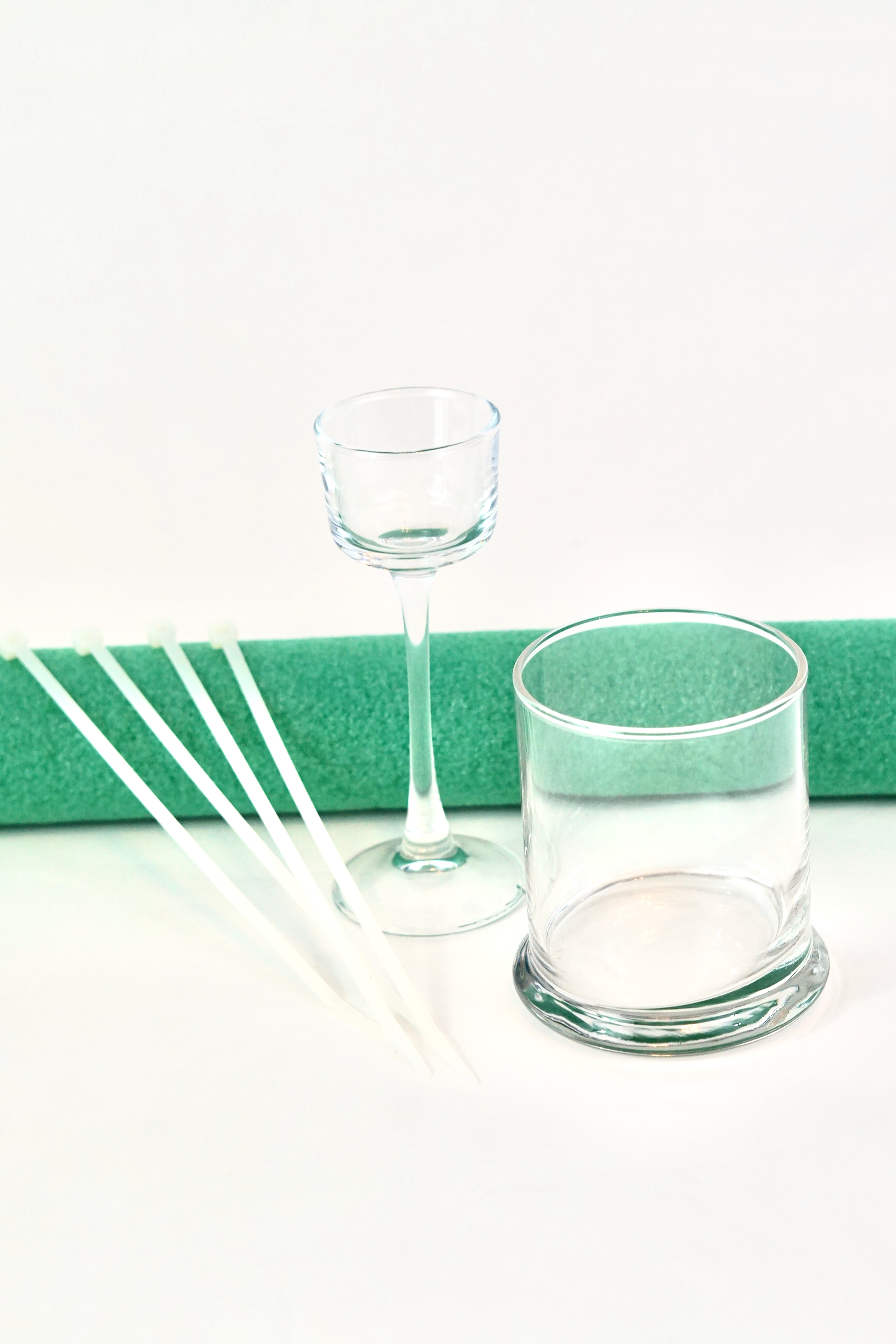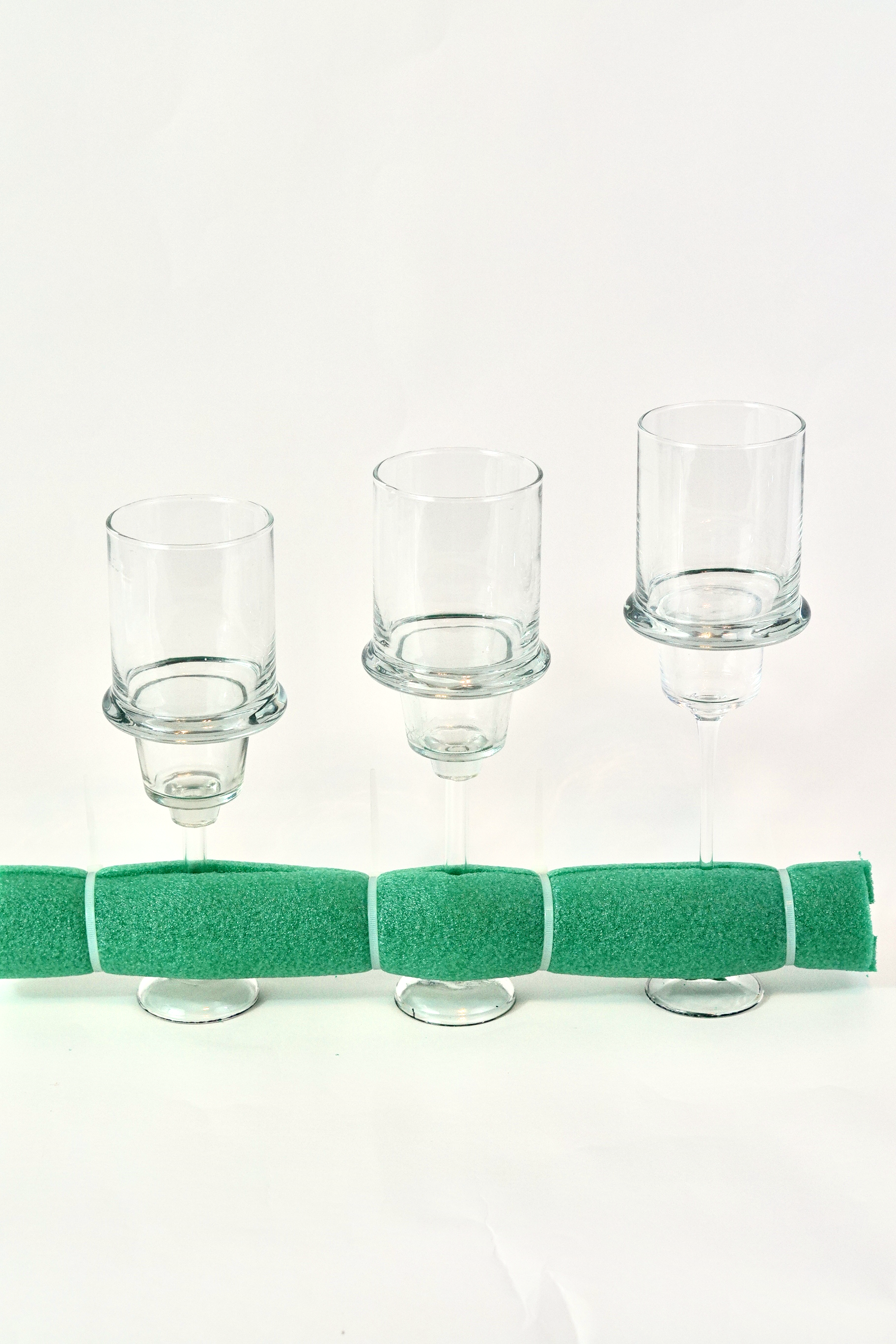 We will start by cutting a 14 inch long Pool Noodle in half using a FloraCraft Foam Cutter. Place 1 Clear Glass Candle Pedestal in the center and secure with an 8 inch Zip Tie on either side. Repeat this step on each side. Trim down any access Pool Noodle foam on the ends.