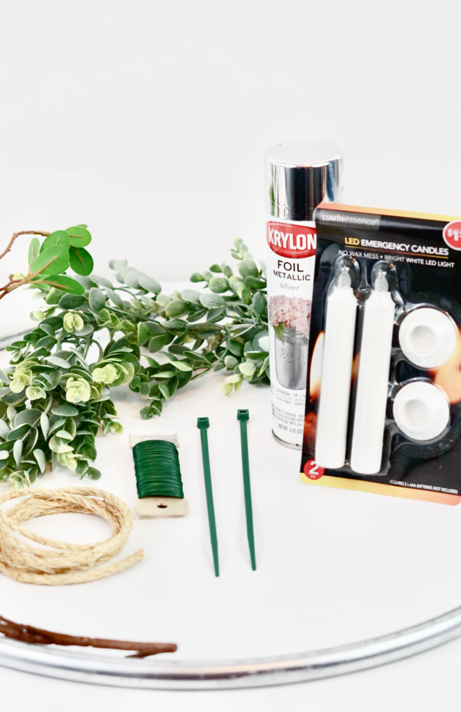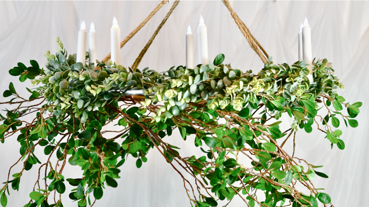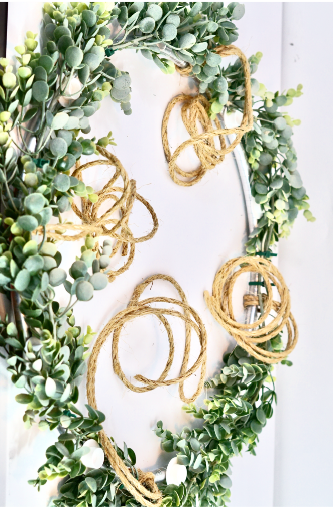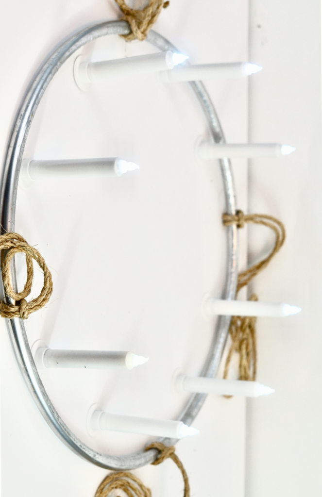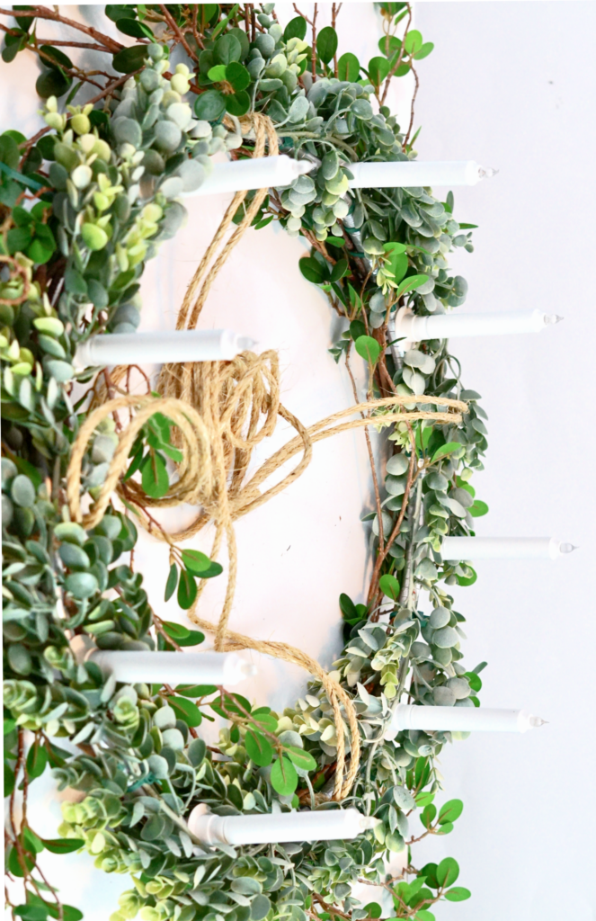 Attach 1 Eucalyptus Garland to the hula hoop using the 8 inch Green Zip Ties. Be sure not to zip tie to close to the candle bases or jute rope knot.