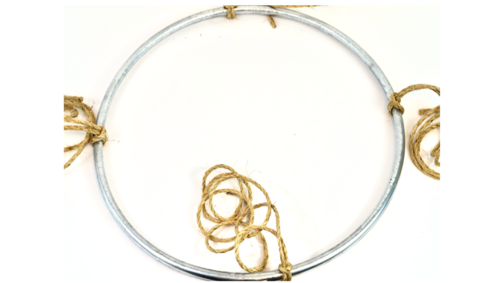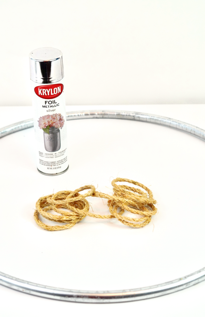 Before we get started, I want you got remember that we give you the plan and you make it your own! Spray paint your Hulu hoop any color you would like. I choose Metallic Silver. Just for a little sparkle and shine. Next we are gonna to attach the Jute Rope. I used 48 inches then doubled it and attached it to the hula hoop using a slip knot. To insure that the rope does not move out of place, add a little hot glue to the slip tie.