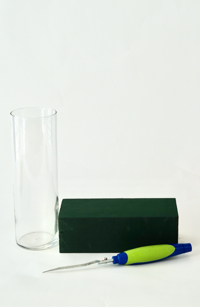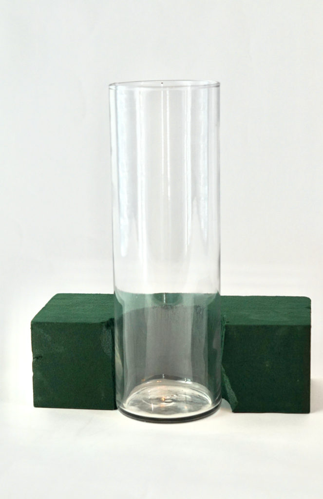 The first thing that we need to do is trim out the center section of the Floral Foam.  Use the rim of the Glass Cylinder Vase to create the pattern to cut.  Trim out the section using the Foam Cutter.