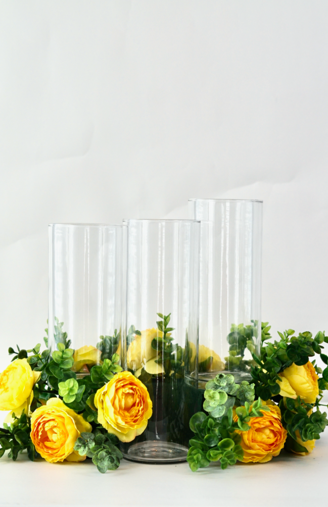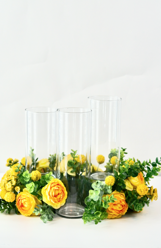 Next, attach 16-20 Eucalyptus Stems, 12-16 Yellow Billy Ball Stems and 6-12 Yellow Babies Breath Stems. Remember you can rearrange the flowers until you are happy with their placement.  Once you are happy put a dab of hot glue on the stem for extra security and reattach them to the foam block. Finally fill the vases 2/3 with water and add the Floating Disc Candles.